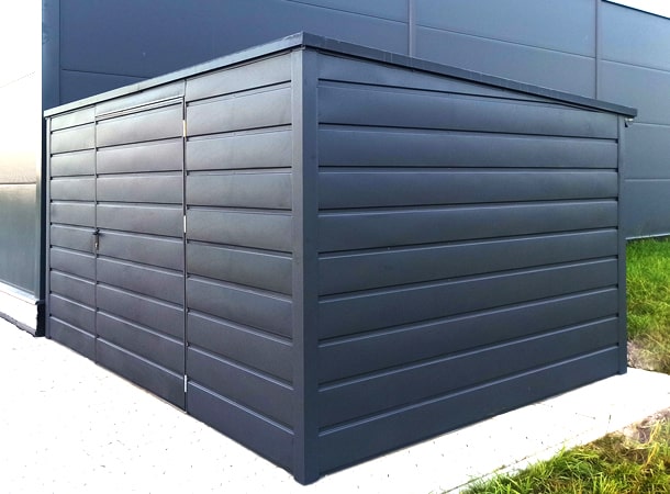 4x3m-es DELUX kerti tároló hátra lejtő tetővel, ajtóval, szegélyezéssel, széles vízszintes lemezeléssel, horganyzott vázszerkezettel