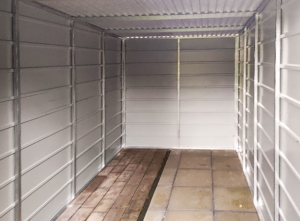 2,05×3,4m-es DELUX kerti tároló hátra lejtő tetővel, ajtóval, szegélyezéssel, széles vízszintes lemezborítással, horganyzott vázszerkezettel