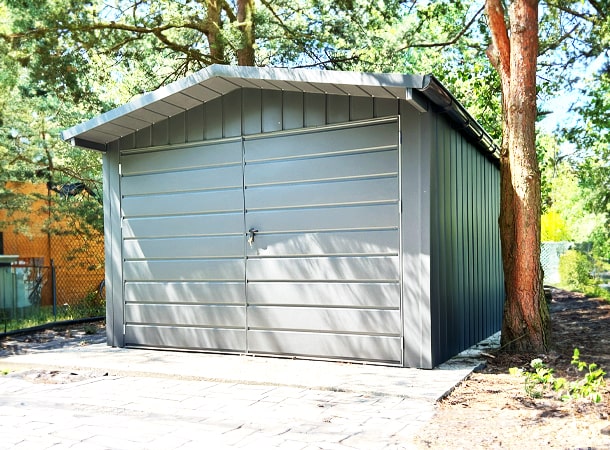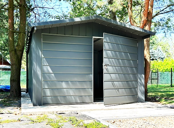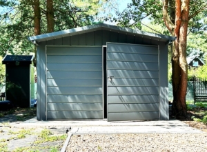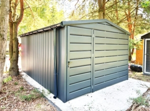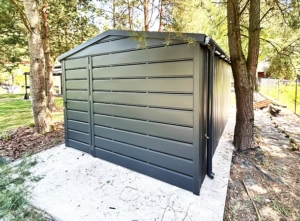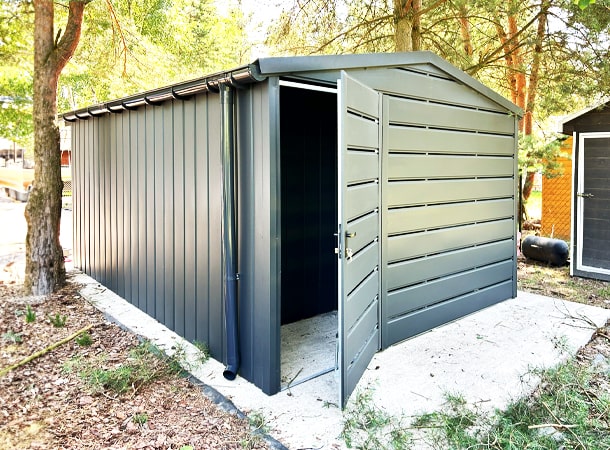 3,5x5m-es DELUX tároló nyeregtetővel, kétszárnyú kapuval és ajtóval, ablakkal, ereszcsatornával, szegélyekkel, vízszintes lemezborítással, horganyzott vázszerkezettel