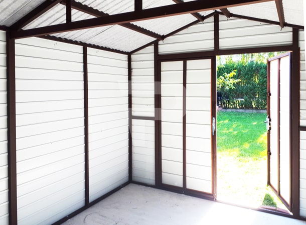 3x4m-es DELUX kerti tároló nyeregtetővel, kétszárnyú kapuval, ablakkal, szegélyekkel, ereszcsatornával, dupla festékréteggel kezelt (barna) vázszerkezettel, vízszintes lemezborítással