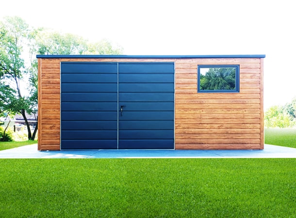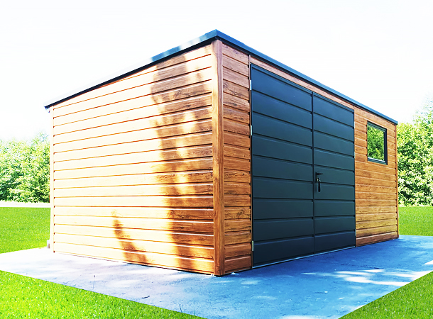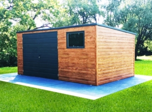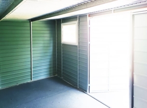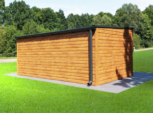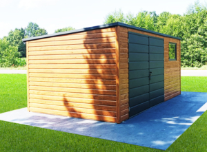 5x3m-es DELUX kerti tároló hátra lejtő tetővel, kétszárnyú kapuval, ablakkal, szegélyezéssel, ereszcsatornával, vízszintes lemezeléssel, horganyzott vázszerkezettel
