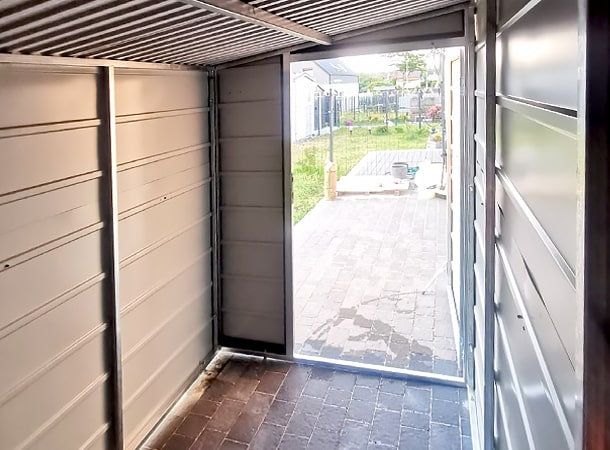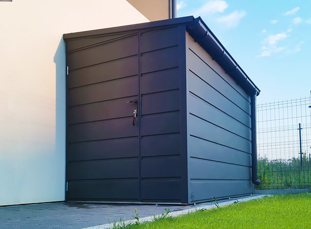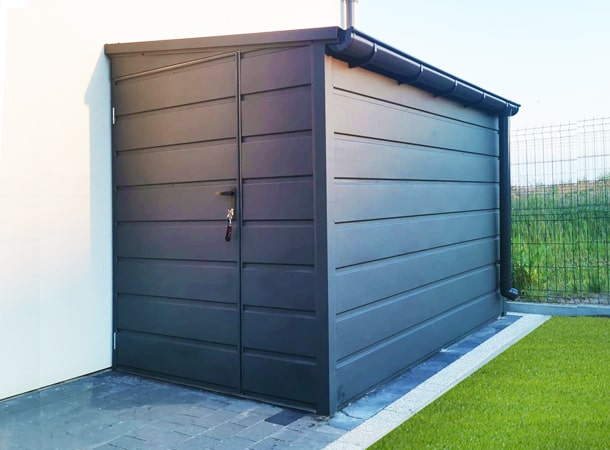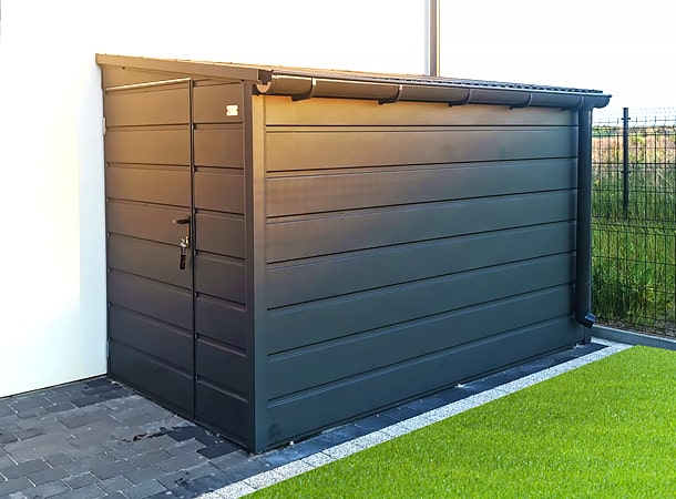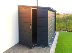 1,6×2,8m-es DELUX kerti tároló, jobbra lejtő tetővel, ajtóval és tetővel, szegélyezéssel, ereszcsatornával, széles vízszintes lemezeléssel, horganyzott vázszerkezettel