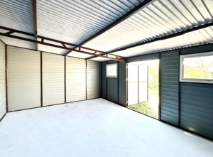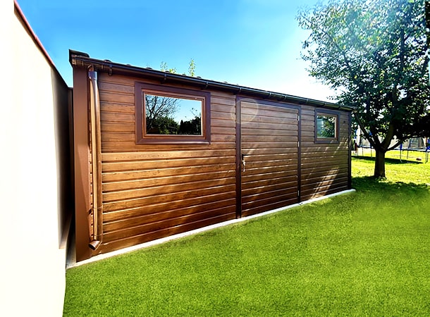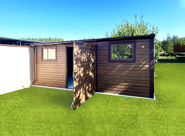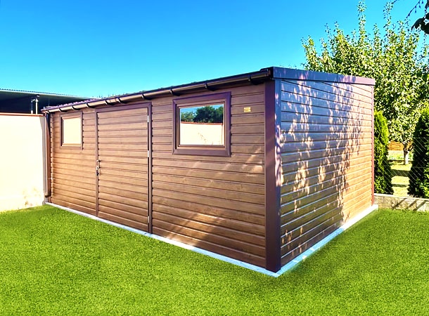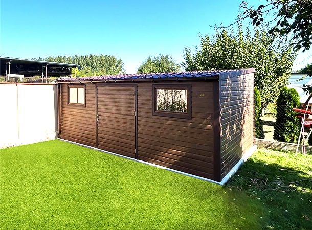 6x4m-es DELUX kerti tároló előre lejtő tetővel, cserepeslemez borítással, ajtóval, 2db ablakkal, szellőzőráccsal, ereszcsatornával, dupla festékréteggel kezelt (barna) acélváz, vízszintes lemezborítással
