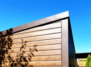 Lemezborítás: I. osztályú színes trapézlemez – a teljes épület vízszintes lemezborítással