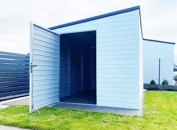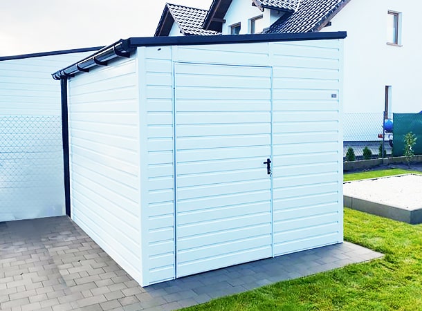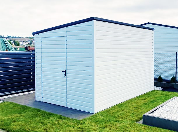 A DELUX kivitelű fém kerti tároló (más néven lemez tároló vagy trapézlemez kerti tároló) alapára már tartalmazza a gyártást, a szállítást és az összeszerelést.