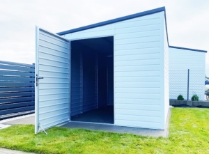 2,2×3,5m-es DELUX kerti tároló, balra lejtő tetővel, ajtóval, szegélyezéssel, ereszcsatornával, vízszintes lemezeléssel, horganyzott vázszerkezettel