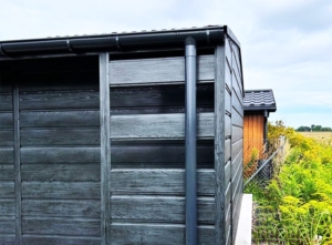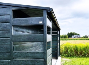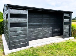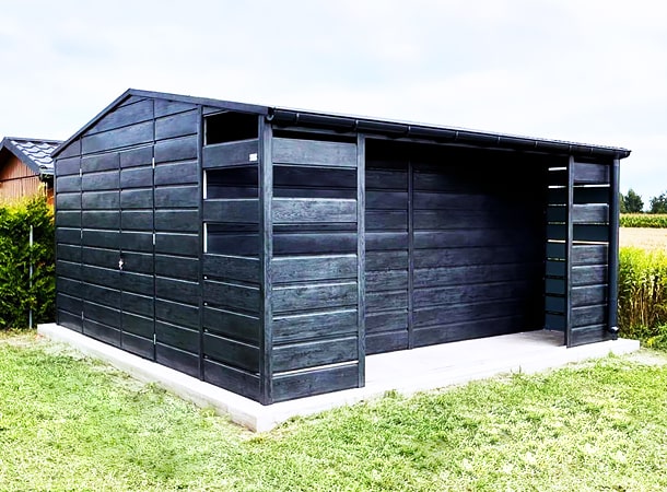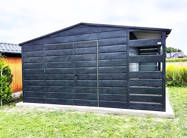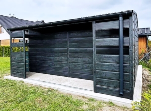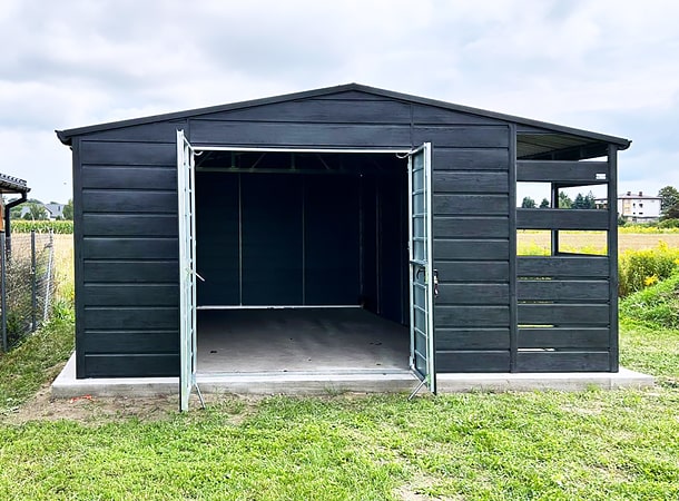 5x5m-es DELUX tároló, nyeregtetővel, jobb oldalán 1m széles nyitott rész, hézagos lemezeléssel, kétszárnyú kapuval, szegélyezéssel, ereszcsatornával, széles vízszintes lemezeléssel, horganyzott vázszerkezettel