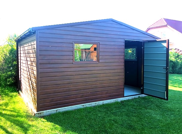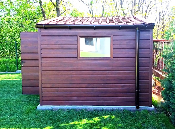 5x3m-es DELUX kerti tároló nyeregtetővel, cserepeslemez borítással, ajtóval, 2db ablakkal, szegélyekkel, ereszcsatornával, dupla festékréteggel kezelt (barna) acélváz, vízszintes lemezborítással