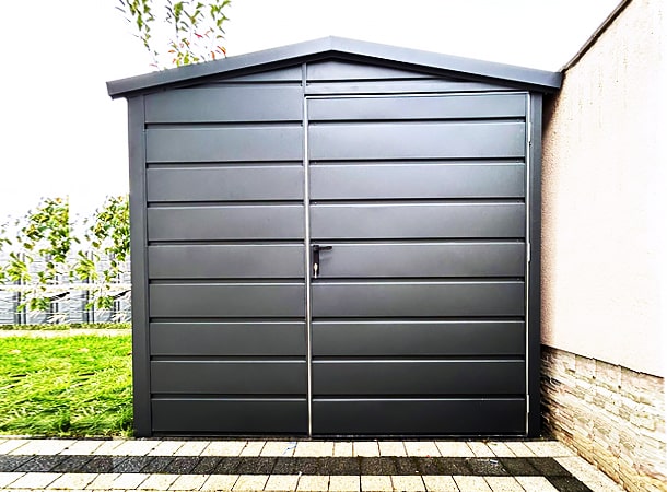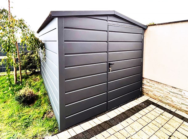 2,3×3,3m-es DELUX kerti tároló nyeregtetővel, antracit szürke falakkal, kétszárnyú kapuval és tetővel, szegélyezéssel, széles vízszintes lemezborítással, horganyzott vázszerkezettel