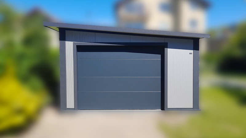 4,5x7m-es szigetelt mobilgarázs / tároló jobbra lejtő tetővel, szekcionált kapuval, ajtóval, ablakkal, szegélyekkel, ereszcsatornával, horganyzott vázszerkezettel