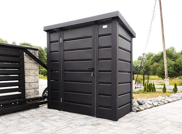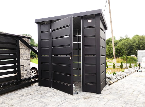 2×1,1m-es DELUX kukatároló hátra lejtő tetővel, ajtóval, szegélyezéssel, vízszintes lemezeléssel, horganyzott vázszerkezettel