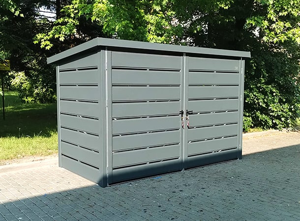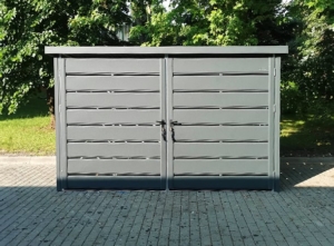 3×1,5m-es DELUX kukatároló hátra lejtő tetővel, 2db ajtóval, szegélyezéssel, vízszintes lemezeléssel, horganyzott vázszerkezettel